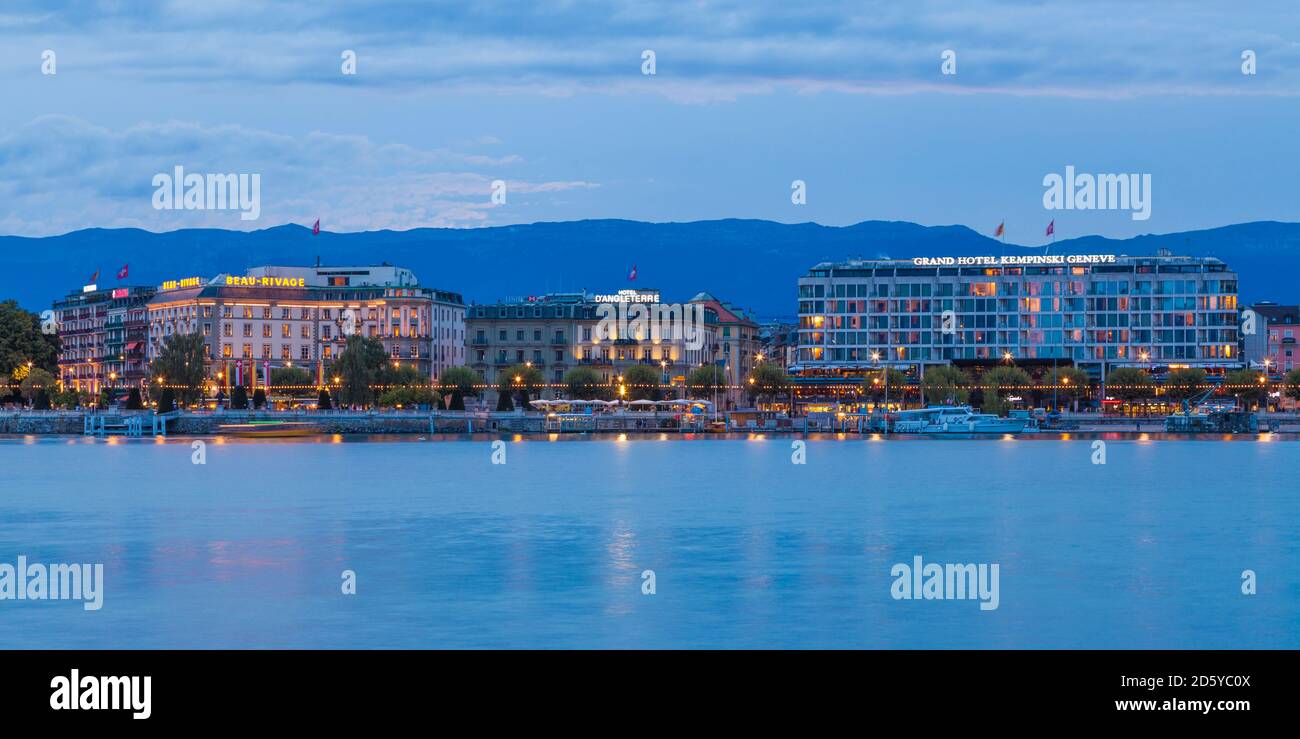 Switzerland Geneva Lake Geneva Luxury Hotels At Dusk Stock Photo Alamy